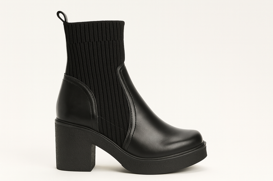 Black Leather & Knit Stretch Ankle Platform Boots