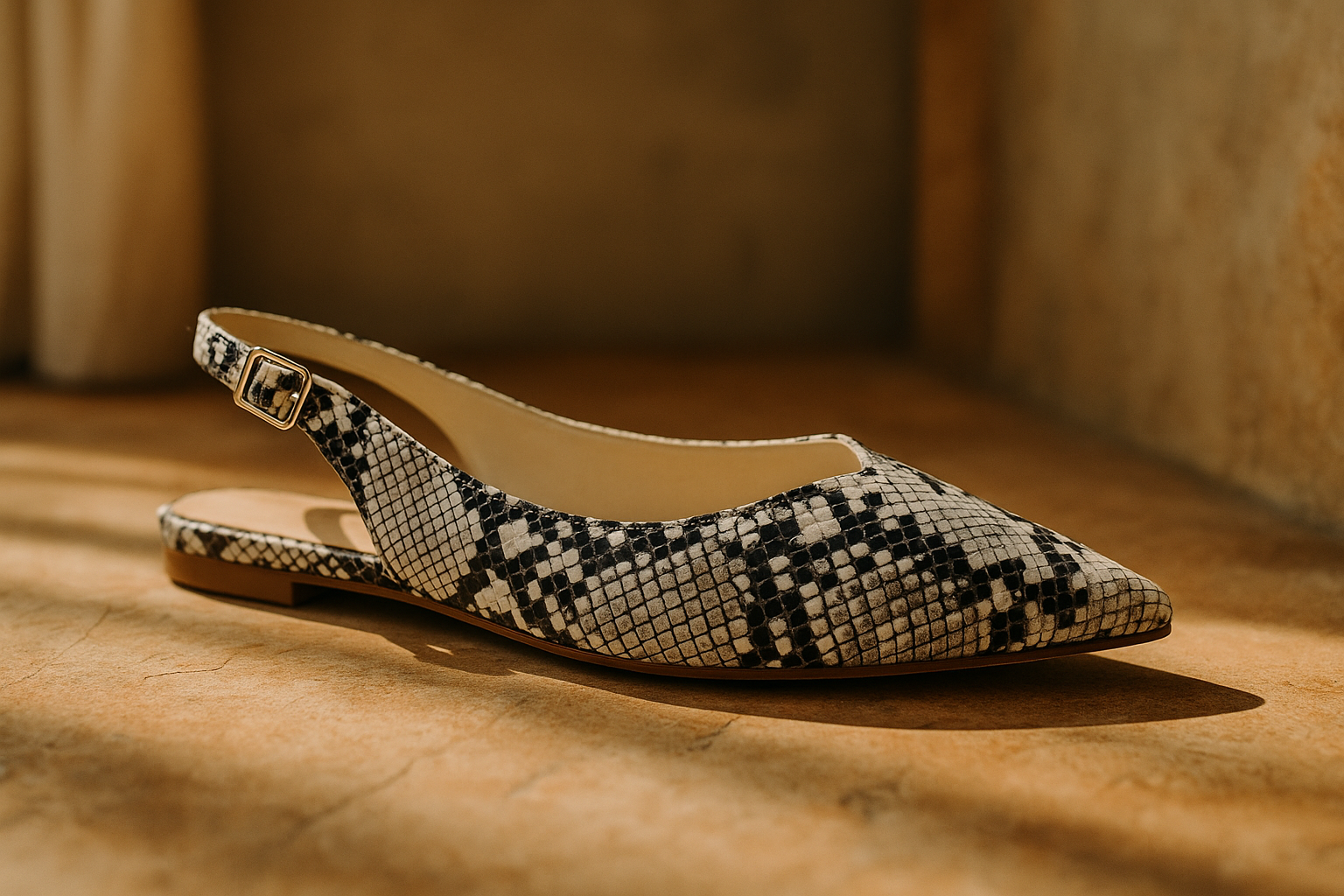 Simple and chic! You need these pointed toe sling backs in your life. Easy with slip on and buckle for best fit. Perfect to add that classy touch to your outfit. Snake print flats with cushioned insole. Medium width and true to size.